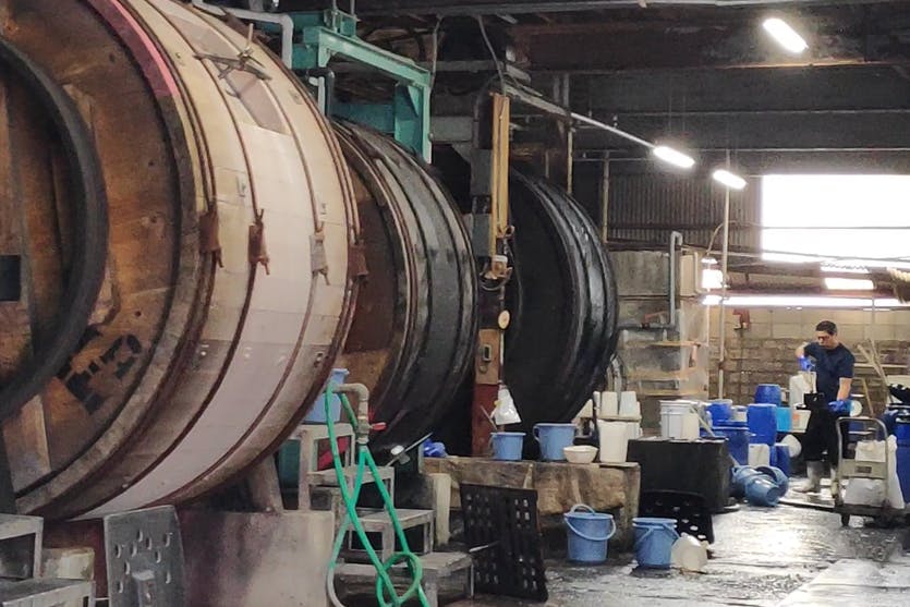 - ウェットブルーをタンナーが様々な色や模様の皮革材料へと染色します。画像のように大きなドラムに皮革裁量を入れ、様々な染色材料と混合することで、皆さんが良く目にする皮革原材料が生まれます。