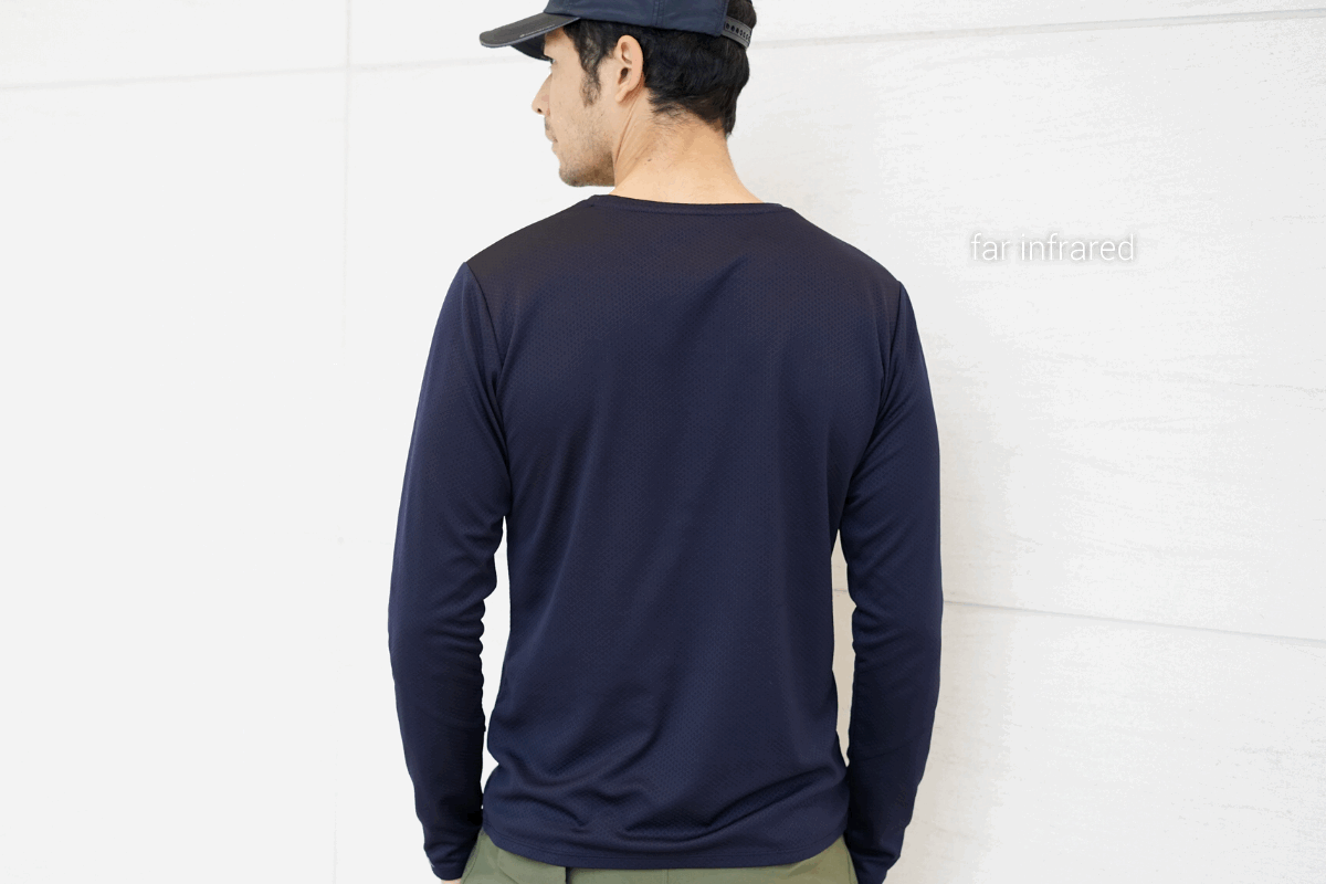 一部に遠赤外線素材を使用しているため、トレーニングウェアやタウンウェアーとしては、春・秋・冬の3シーズンでの使用をおすすめしております。