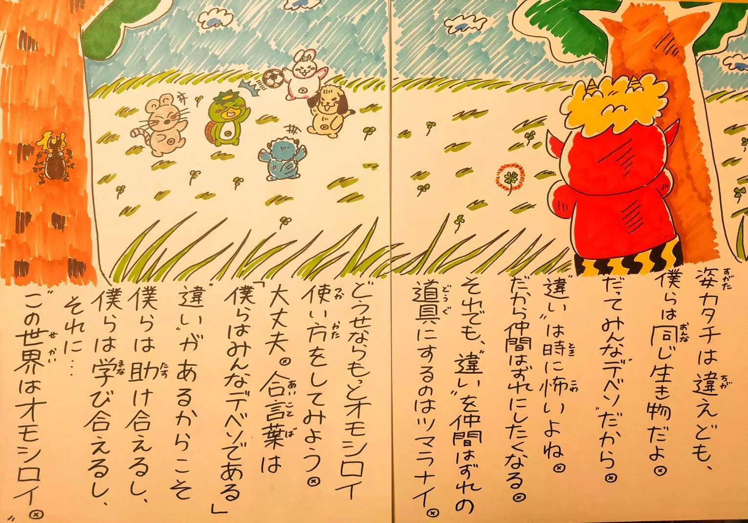 ぼくの絵本を通して、「デベソ」というマークや、言葉を見聞きした時に「お前の母ちゃんでべそ!」ではなく、「デベソは違いを面白がろう!という合言葉」だよね。そんな風に違いを捉える人が増えたらいいなぁ、と願っています。