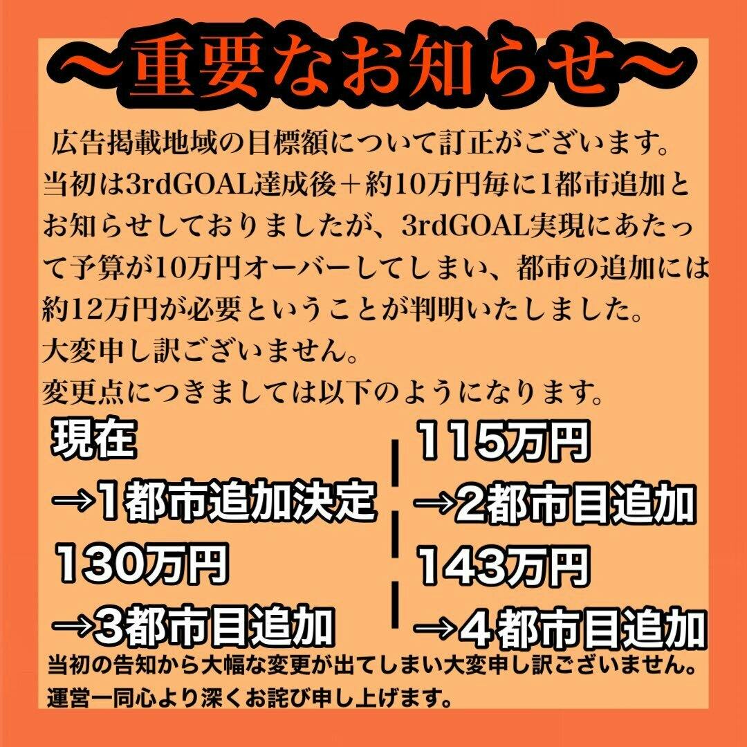 当初は3rd Goal達成後 +約10万円毎に1都市追加とお知らせしておりましたが、3rd Goal実現にあたって予算が10万円オーバーしてしまい、都市の追加には約12~15万円が必要ということが判明しました。