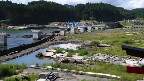 とにかくJRが来れる日程で招聘して展覧会の内容を詰めようということで 9月の9日から13日の来日を決めた。JR自身はワタリウム美術館の展覧会が過去の作品も紹介する回顧展形式の初の美術館での展覧会になる。だから東京で展示を詰めたいとの依頼があった。 しかし、ワタリウム美術館として、私と姉とで震災の被害のあった地域と繫がっていく展覧会にしたいとの思いがあった。JRならば被災地と東京を繋げ世界に発信していけるアーティストという思いがあった。ダメもとでもいいからとにかく東北の現状を見ようということで私たち弟姉は大胆にもジャーナリストの津田大介さんに一泊2日でざっと廻れるコースを組んでもらって車で一緒に旅行したわけです。仙台から石巻、南三陸、気仙沼、陸前高田をまわり、津田さんの知り合いの漁師だったり商店会の人たちとあって現地の状況を生で見たのです。1年は経ったといえ、仙台から徐々に北上していった経緯は個人的にはかなりショックだった。石巻の雄勝町での入組んだ湾にまで津波が押寄せ街ごとなくなっていたの光景は忘れられない。 一見きれいな草原の様に見えるが、その間から建物の基礎コンクリートが見えるのがよけいに痛々しかった記憶がある。 この旅でどのようにJRに被災地の事を見せたり、現地の核になるような人や場所をおぼろげに決め何としてもJRを東北へ連れて行ってプロジェクトをやろうと決心した。
