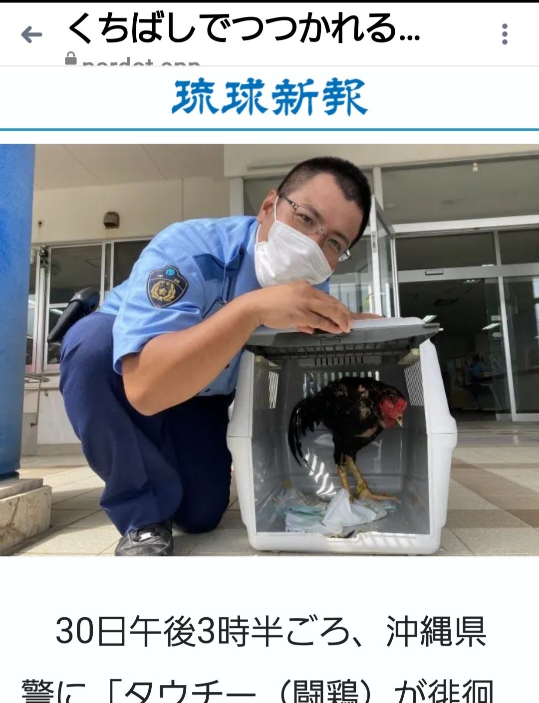 30日午後3時半ごろ、沖縄県警に「タウチー(闘鶏)が徘徊(はいかい)している」と110番通報があった。発見場所のうるま市田場のアパート敷地にうるま署の安慶名交番勤務の西里竜一巡査長(33)ら3人の警察官が急行。アパート駐車場付近に迷い込んいでたタウチーを保護した。西里巡査長は「警察官になって7年。迷子の保護はあっても、迷子の闘鶏には初めて対処した」と笑顔。うるま署は一時保護し、飼い主などに関する情報提供を呼び掛けている。