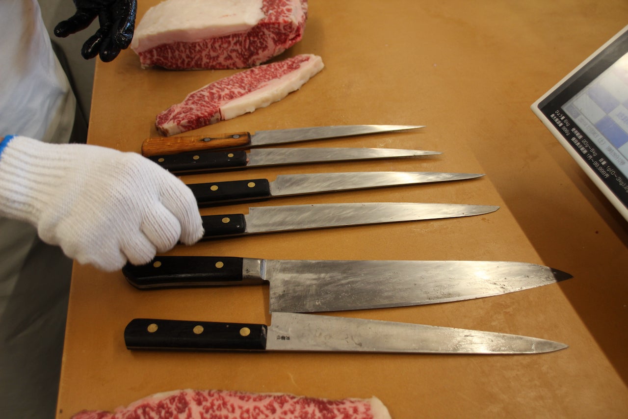恐縮にも握らせてもらったら、意外と軽い!大きな塊を切るので〜出刃包丁みたいに重くてドスンと切る感じだと思いきや、軽いんです。刃の技術が高くてスゥーっと切り感じなんだろうな〜と思いました。
