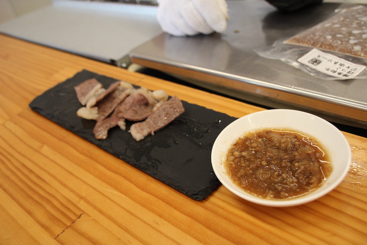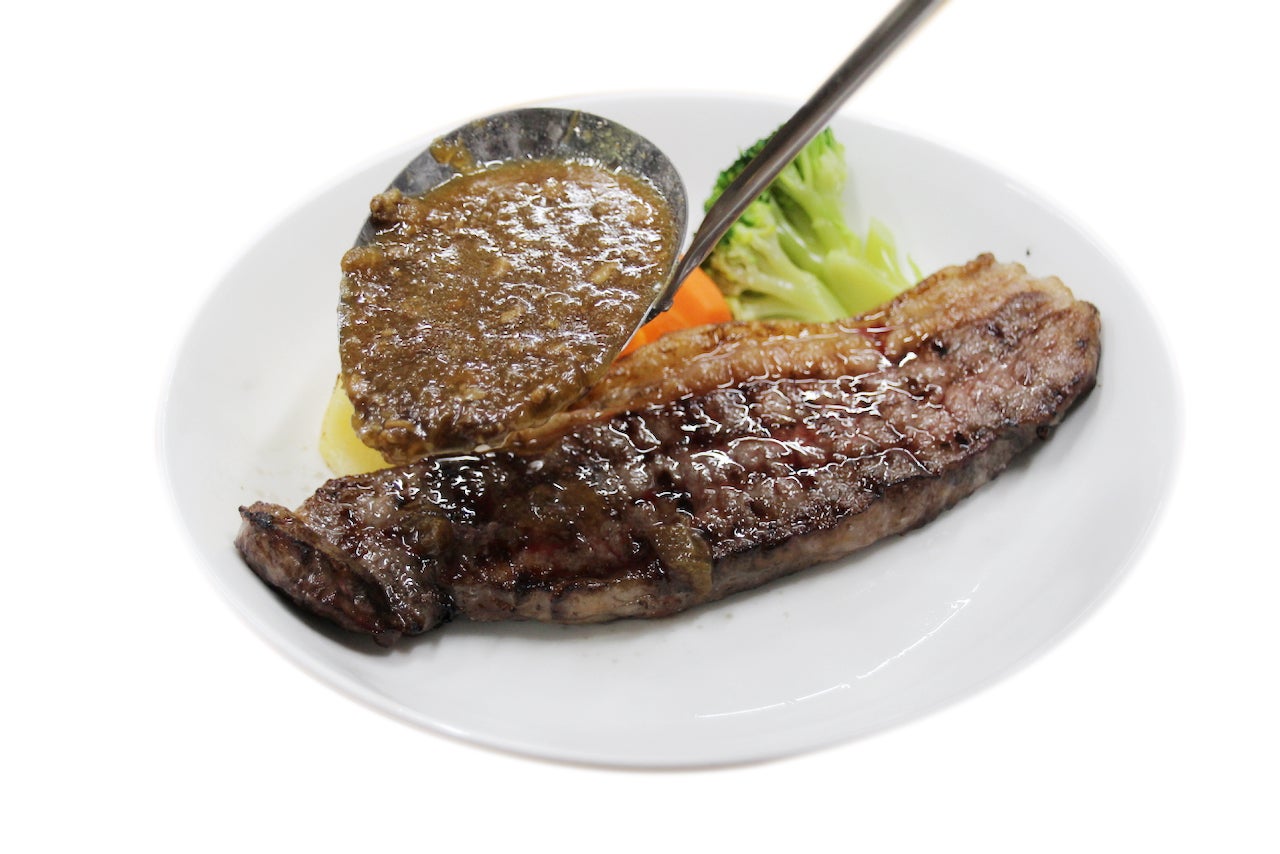 柳川産博多和牛の特徴は、サシが程よく入っておりますが、食べると見た目ほど脂っこくなく、食べた方は皆さん「何枚でも食べれる!」とおっしゃっていただきます。飼料からこだわり、安心安全な博多和牛を多くの皆様に味わっていただきたいです。焼きに関しましても私の方で一枚一枚大切に焼かせていただきます。また、さらに美味しく味わっていただくためにジャポネソースも当店オリジナルです。このソースにも柳川産博多和牛を使用しています。このステーキ用に開発した「ほっとジャポネソース」も、野菜の付け合わせとともに、ご堪能ください。