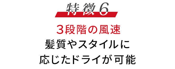 3段階の風速で、お風呂上がりのドライから繊細なスタイリングまで風速の使い分けが可能。