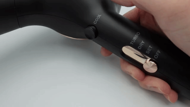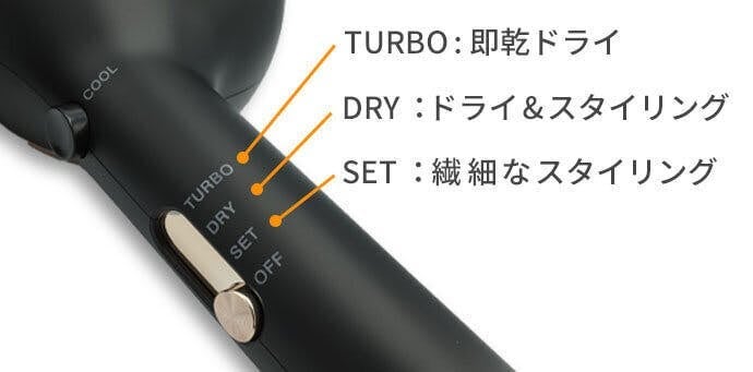 ターボ(超強風)、ドライ(強風)、セット(弱風)の切り替え、「COOL」ボタンを押すと冷風に切り変えなど、手元での操作だけで完結するので、かんたんな操作性でご家族みんなでお使いいただけます。