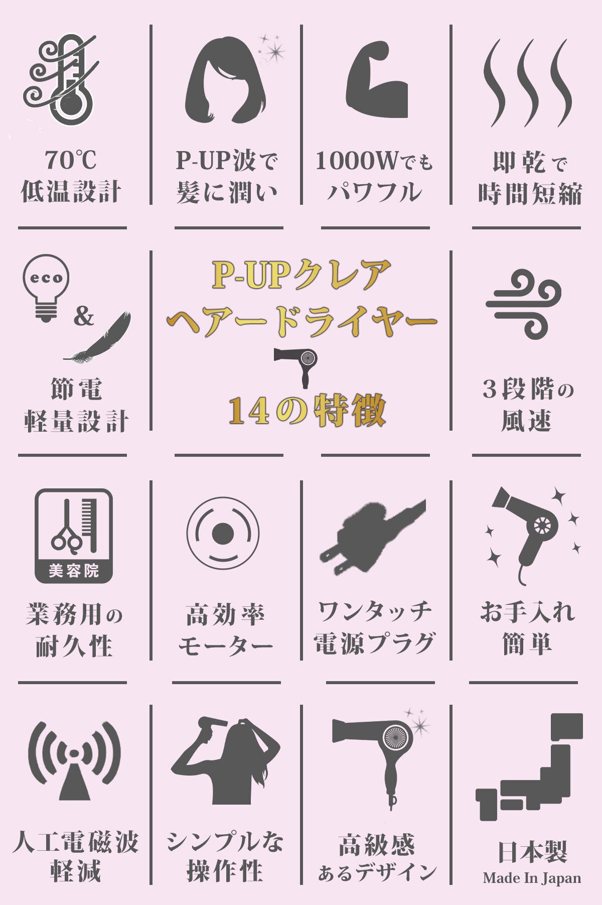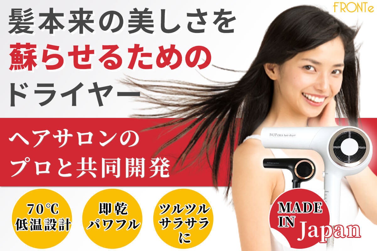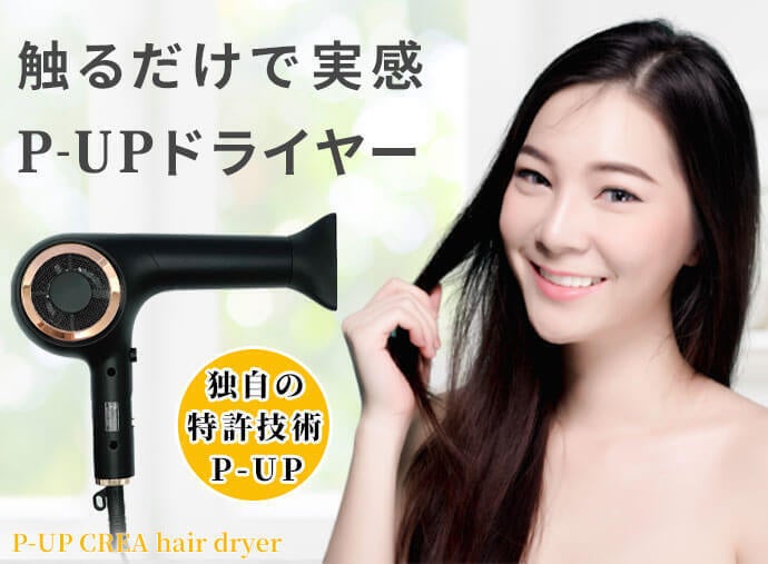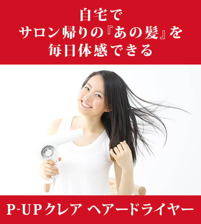 P-UPクレア ヘアードライヤーは、毛髪への有害性を低減させ、正しい方法で髪を乾かすことができるように設計し、誕生したヘアドライヤーです。
