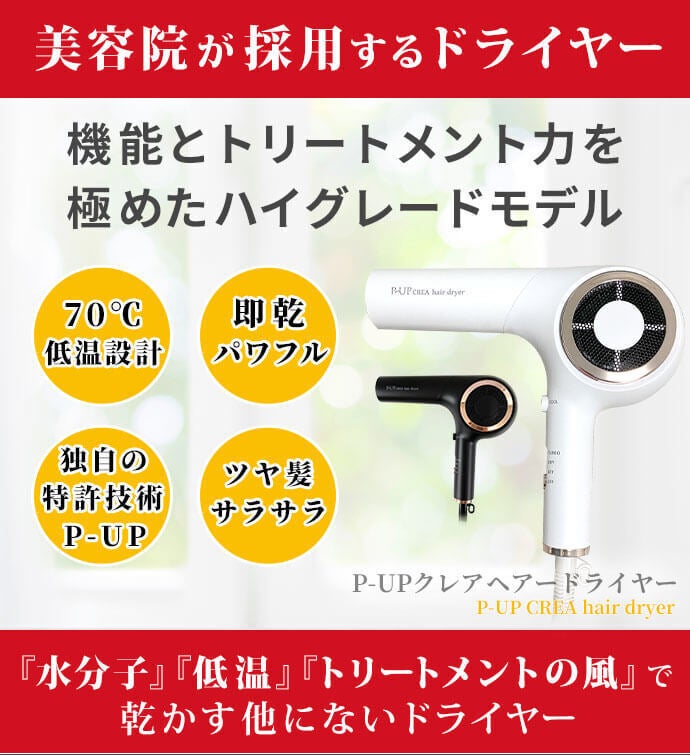 プロのサロンが採用する高機能ヘアドライヤーの”P-UPクレア ヘアードライヤー”。