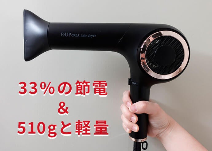 一般的な1500Wタイプのハイパワードライヤーと比べると約33.3%も節電できます。さらに、本体重量は510gと軽量で長時間の使用でも便利です。