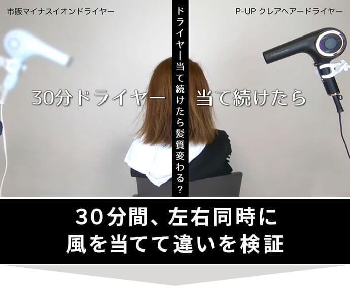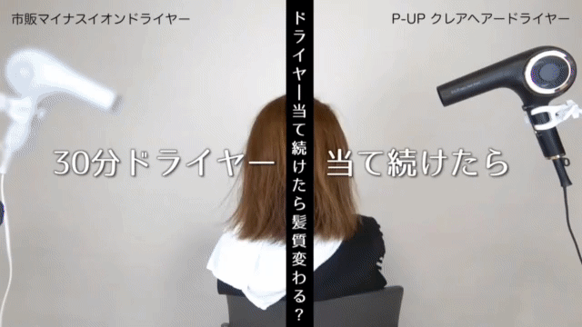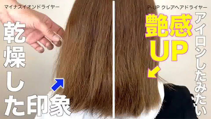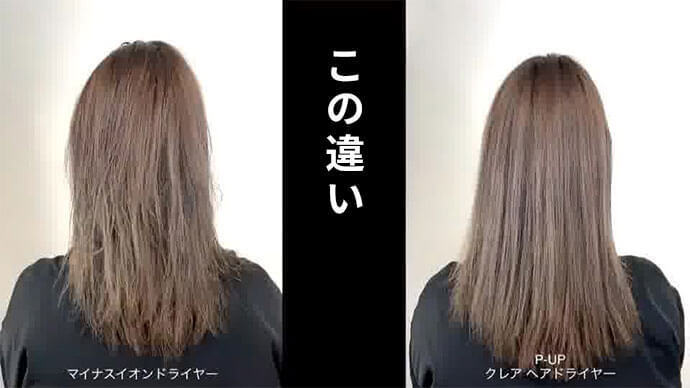 左がマイナスイオンドライヤー、右がP-UPクレア ヘアドライヤーで乾かした様子です。P-UP波が髪に届き、ツヤやまとまりに違いが出ます。