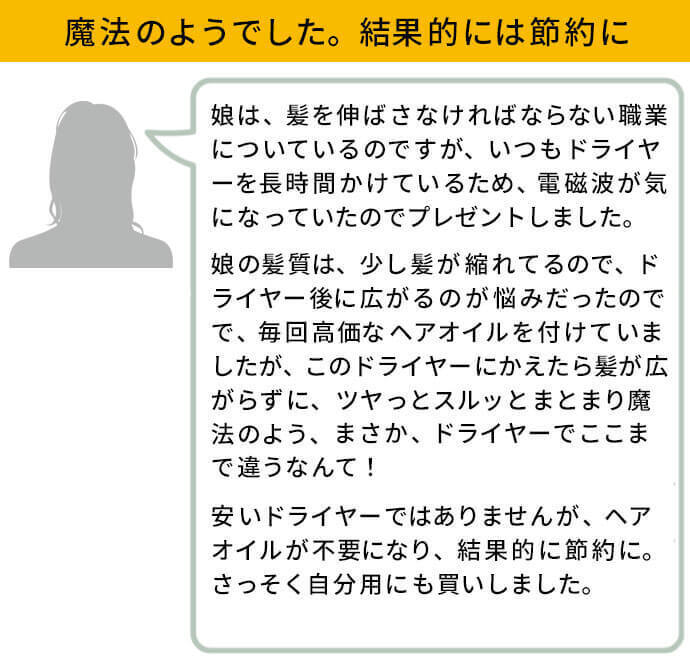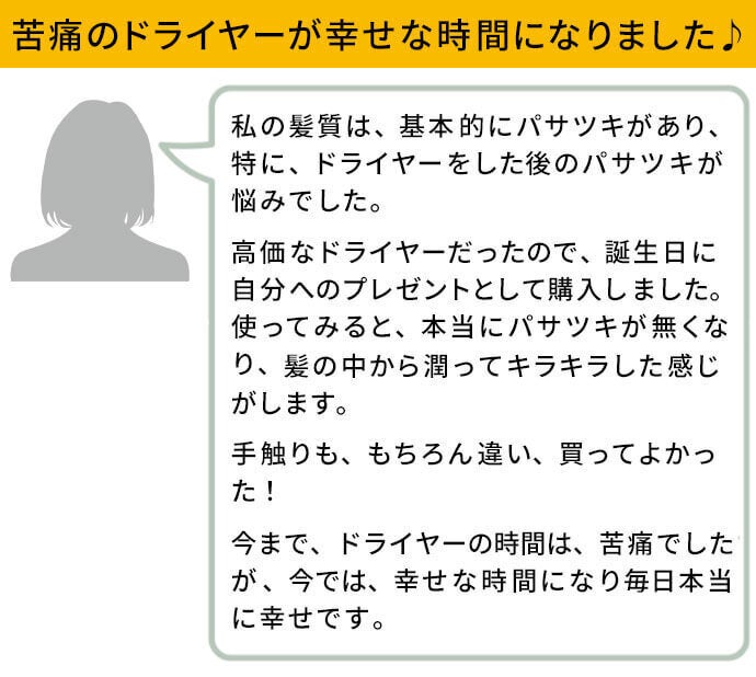 P-UPクレア ヘアードライヤーをご利用いただいたお客様の感想をご紹介させていただきます。