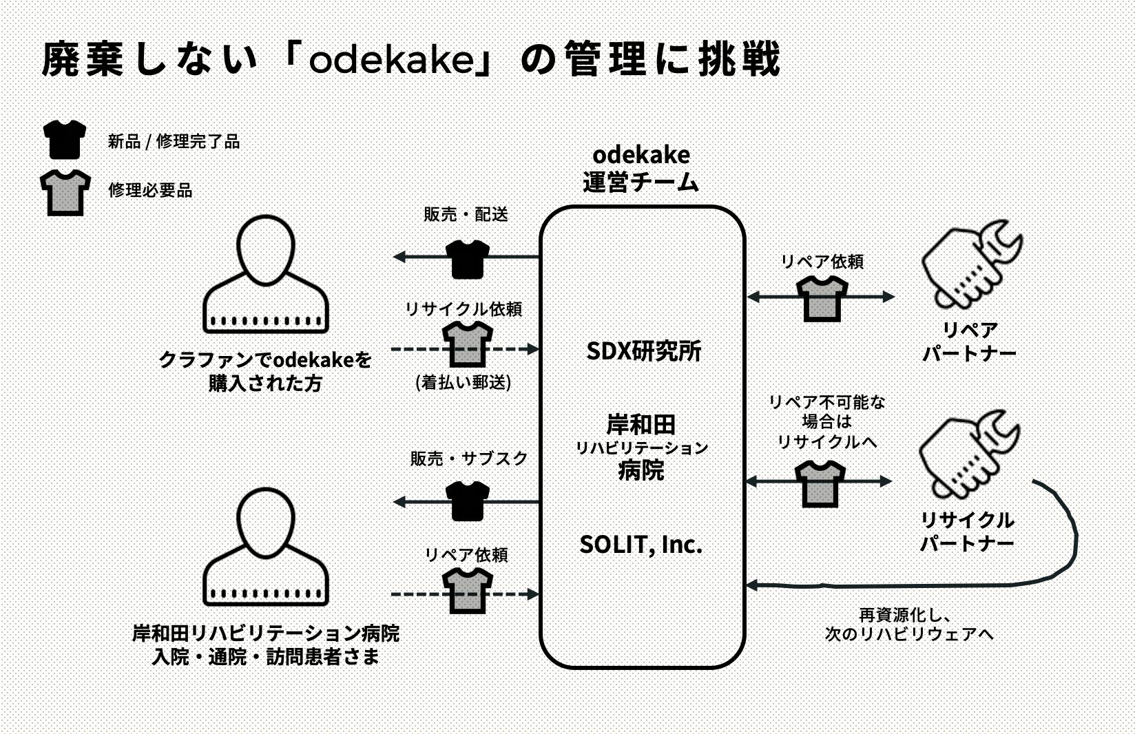 今後、具体的には、『odekake』の修理が必要になった場合はリペア業者と連携し、仮に全く使えなくなった場合はリサイクル業者と連携し、また別のリハビリウェアとして生まれ変われるような循環プロジェクトを実施していく予定です。また、岸和田リハビリテーション病院の入院患者さまに対しては、少量ではありますが、『odekake』のサブスクリプションシステムを作り、患者さまの症状や障がいの状態が例え変化したとしても、その状態に応じた『odekake』をいつでもお渡しできるように致します。