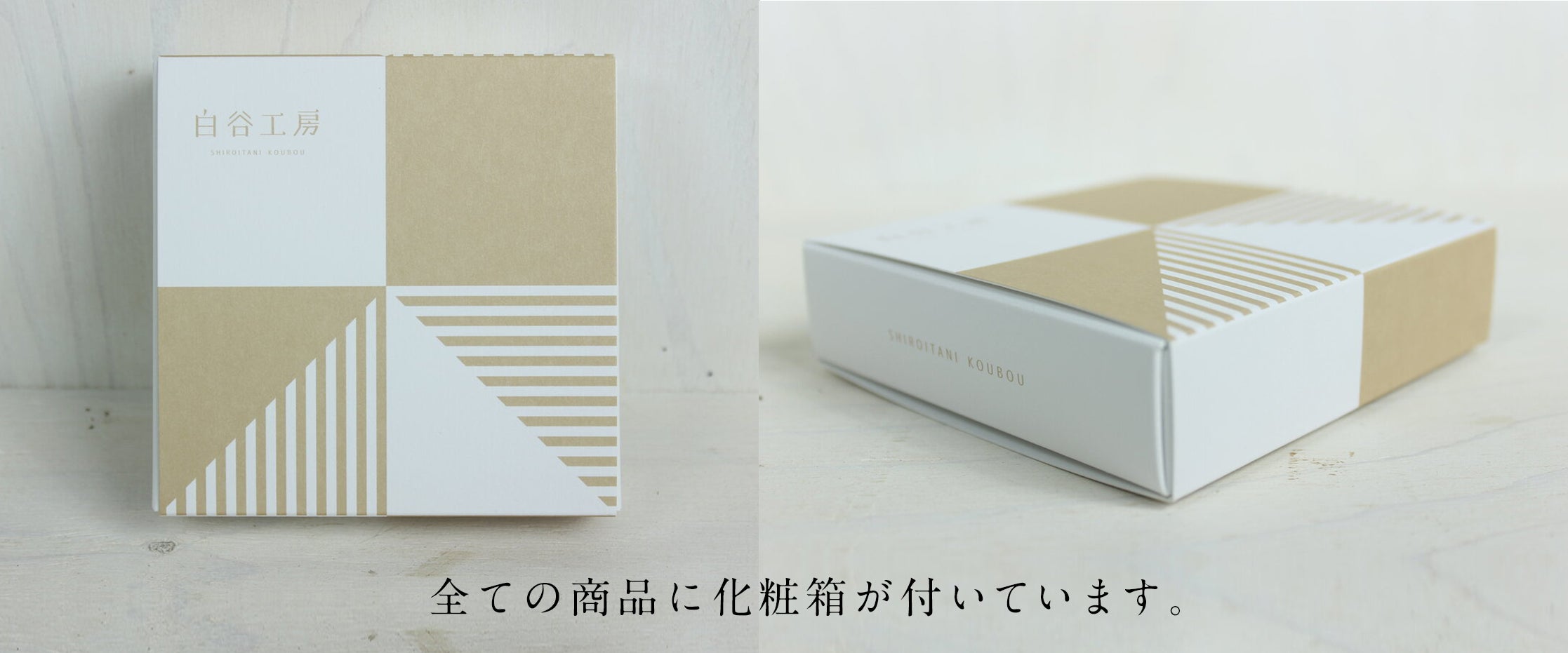 全ての商品に白谷工房の化粧箱が付属します。通常は有料で提供している化粧箱ですが、今回限り全ての商品にセッティングいたします。