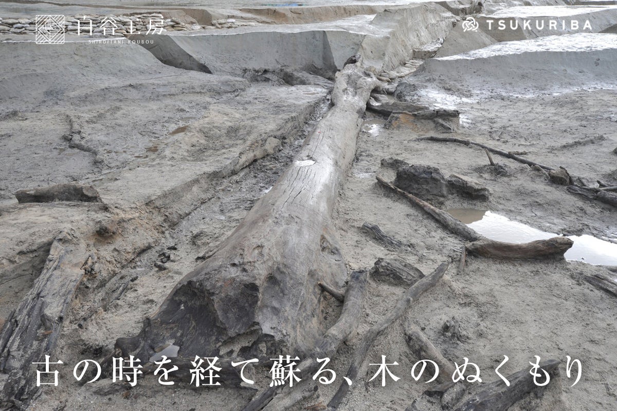 2700年前と言うと弥生時代。悠久の時を感じられるこの神代欅は、鳥取市の本高弓ノ木(もとだかゆみのき)遺跡から出土したもの。鳥取県埋蔵文化財センターより昨年依頼を受け、白谷工房が製品を手掛けることとなりました。