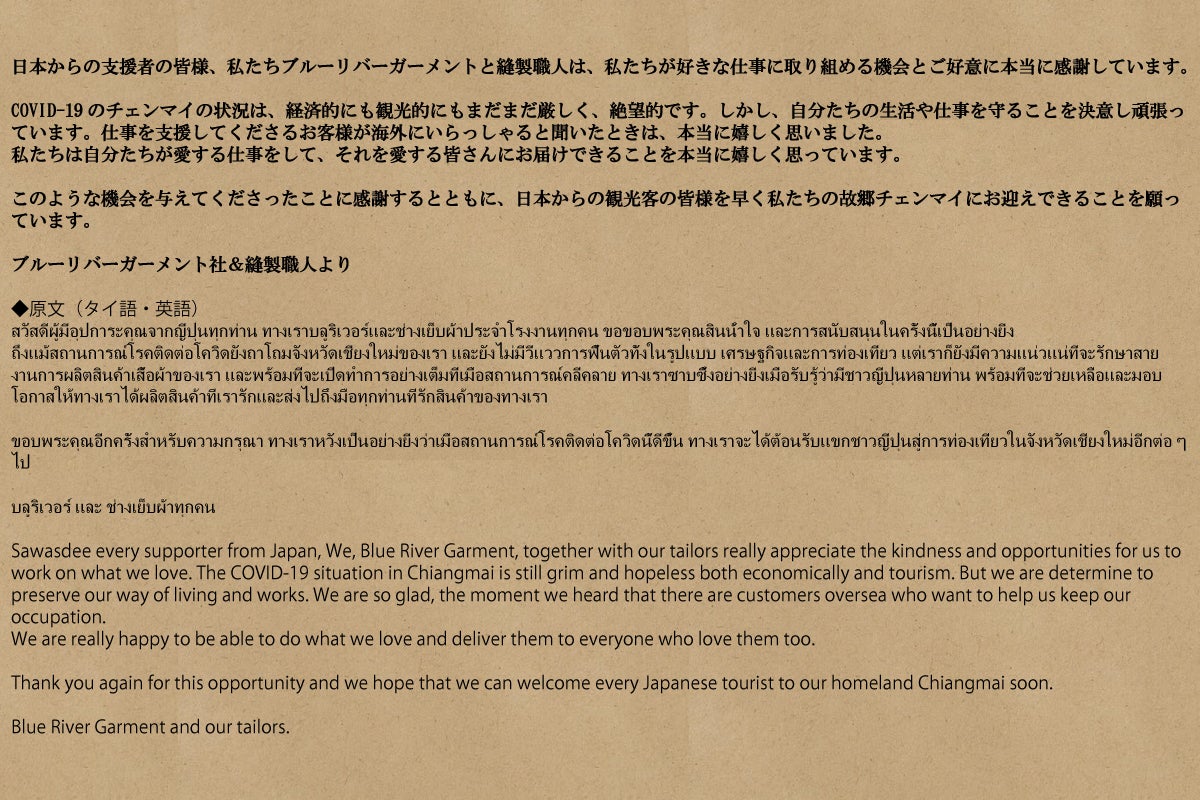 タイにある縫製の協力工場や現地の方々が新型コロナウイルスの影響で生活が非常に困難になっていることを受け、このプロジェクトを開始しました。日本国内も色々な状況で大変ですが、ご一読いただければ幸いです。