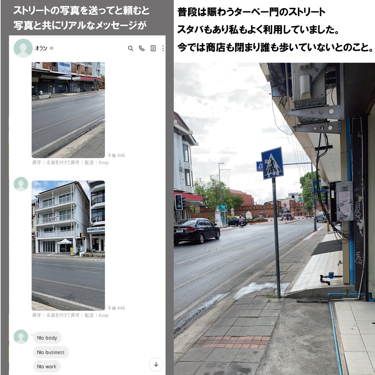 ▽カフェやタイマッサージ店、雑貨店、ホテルが並ぶストリートが誰も歩いていない状態に