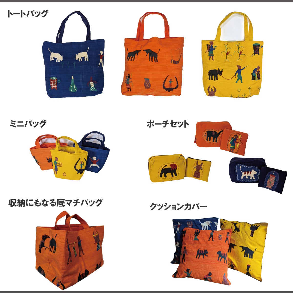 クッションカバー、トートバッグ、ミニバッグ、マルチケット(生地そのまま)に加え