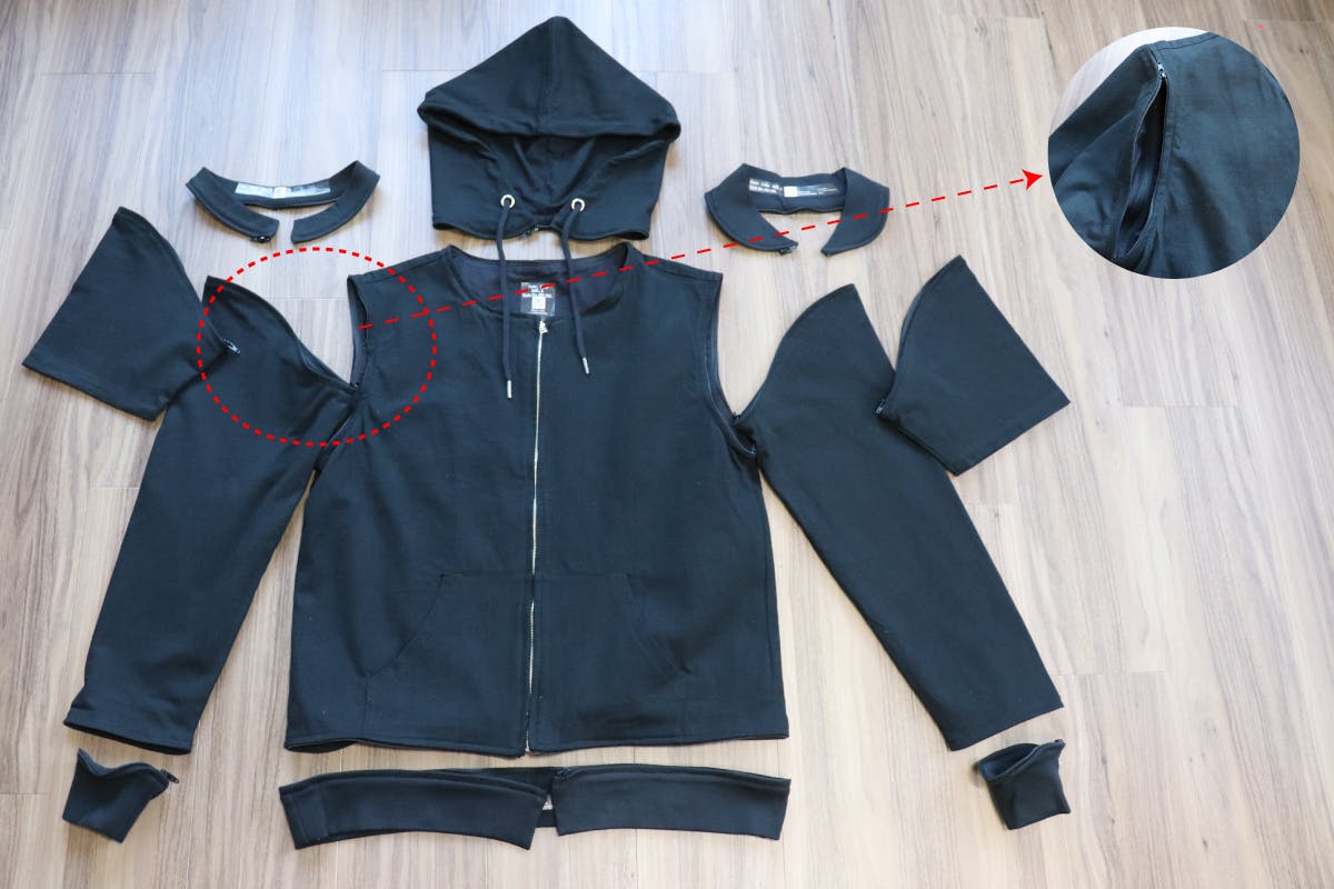 袖や衿回りが元々バラバラになっており、ファスナーで取付/取り外し出来ます。