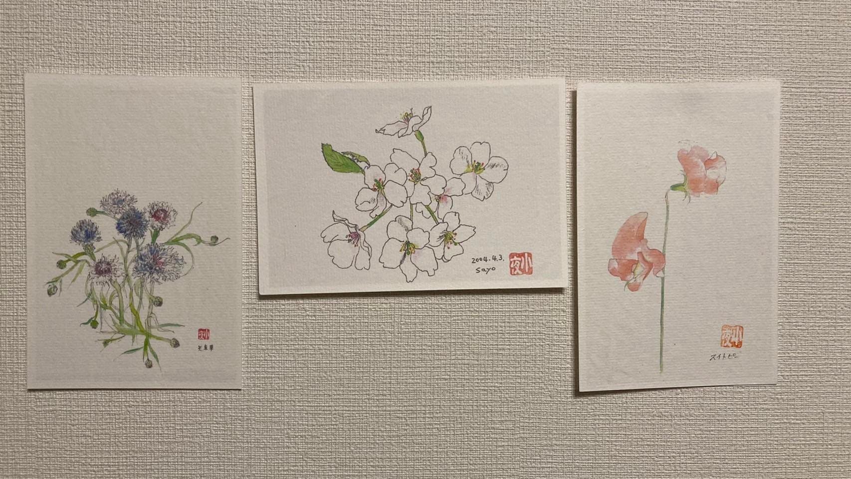 今回、作成して頂いた絵葉書は水彩画のカラーコピーで、春夏秋冬をテーマに4種類あります。季節折々の植物を繊細なタッチで表現されていて癒されます。