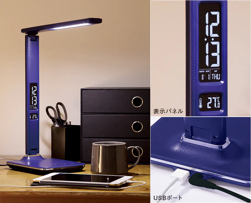 アラーム付き時計(8種類から選べます)・カレンダー・温度計が搭載されていて、パネルに表示されています。