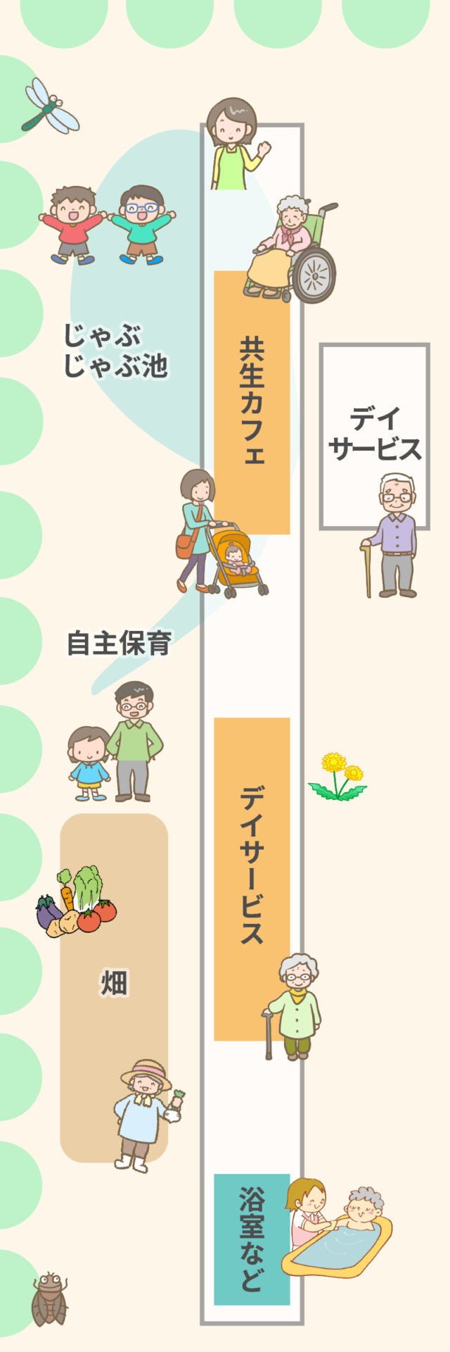 赤ん坊がいて、子供がワイワイ食事をしていて、障がいのある人がいて、爺さん婆さんが笑ったりしている。日々楽しそう。こんな施設をつくりたいなぁと思っていた。