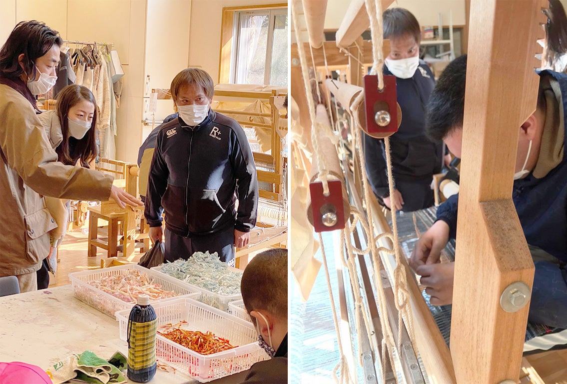 「空と海」で製作工程を熱心に見学する石井さん。左の繊維は座布団の材料になるそう