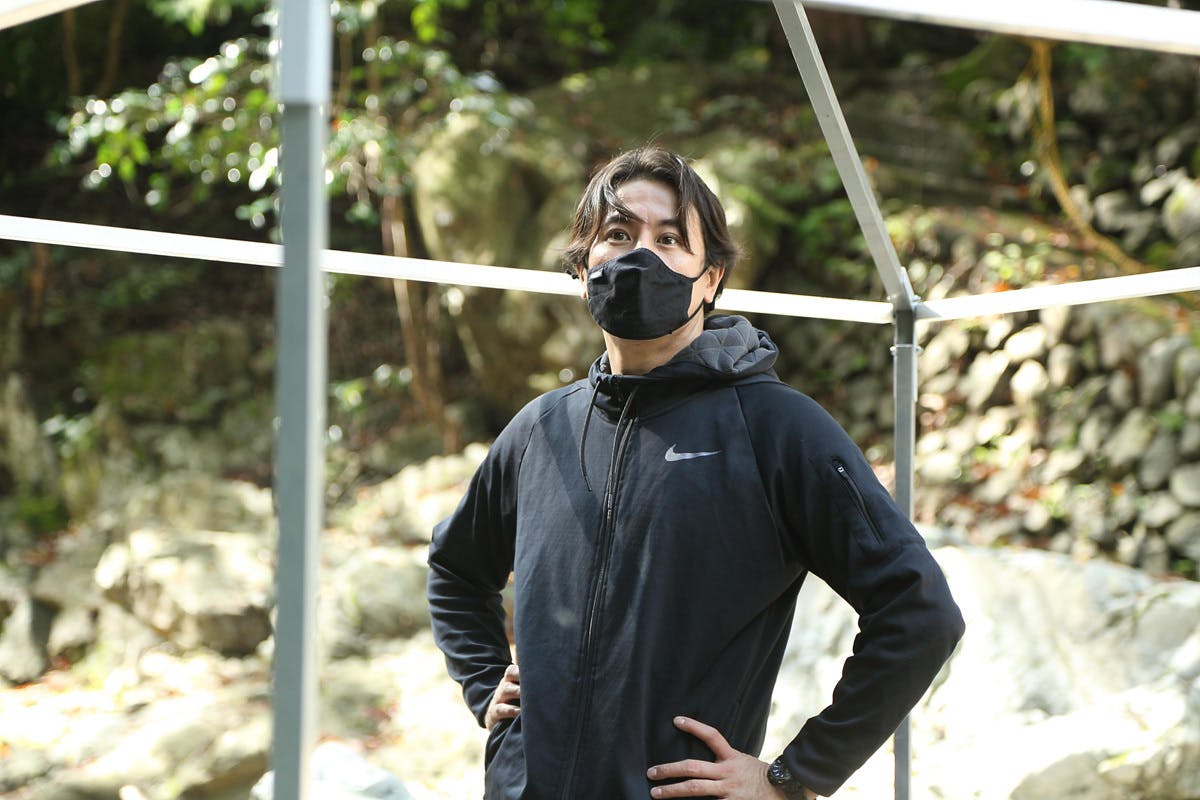 写真は川のほとりでテントサウナを設営している僕です!