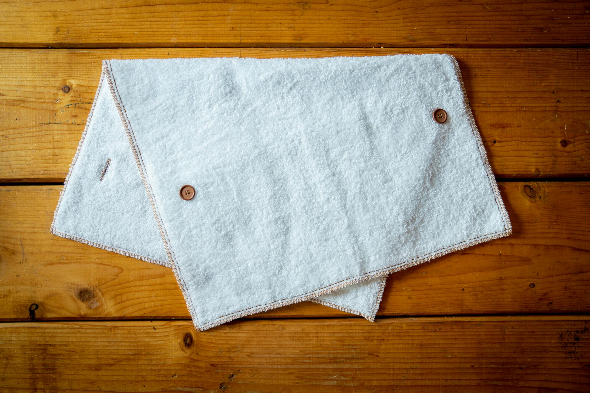 ちなみに最終的な仕様を決めるまでにタオルのサイズやボタンの位置などを変えながら試作品をいくつも作りながらあれこれと試し、「これぞ!」という仕様を選んでおります!