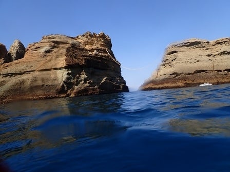 大牛、小牛と呼ばれる海面に突き出た2つの大きな岩が特徴で、2つの岩の隙間には上から光が差し込むクレバスや真っ黒な洞窟があり、神秘的な雰囲気を醸し出しています。牛着岩のポイントは複数のコース取りをすることができ、光の当たり具合によっても見える景色が様変わりすることから、何度潜っても飽きさせることのない魅力があります。