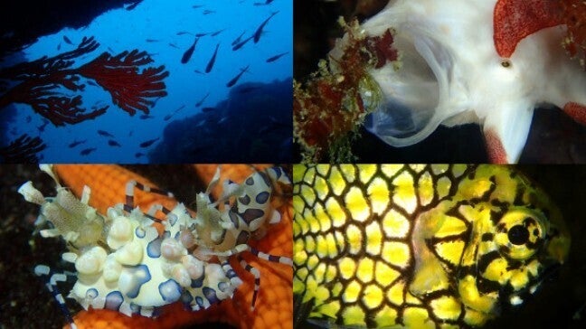 雲見の海の特徴はなんといっても”壮大かつダイナミックな地形”と”種類豊富な生き物たち”。バラエティ豊かなダイビングスポットが点在しており、いずれも海岸から船で数分~10分程度で到着する近場に位置しています。 以下、ダイビングスポットの様子を紹介させて下さい!