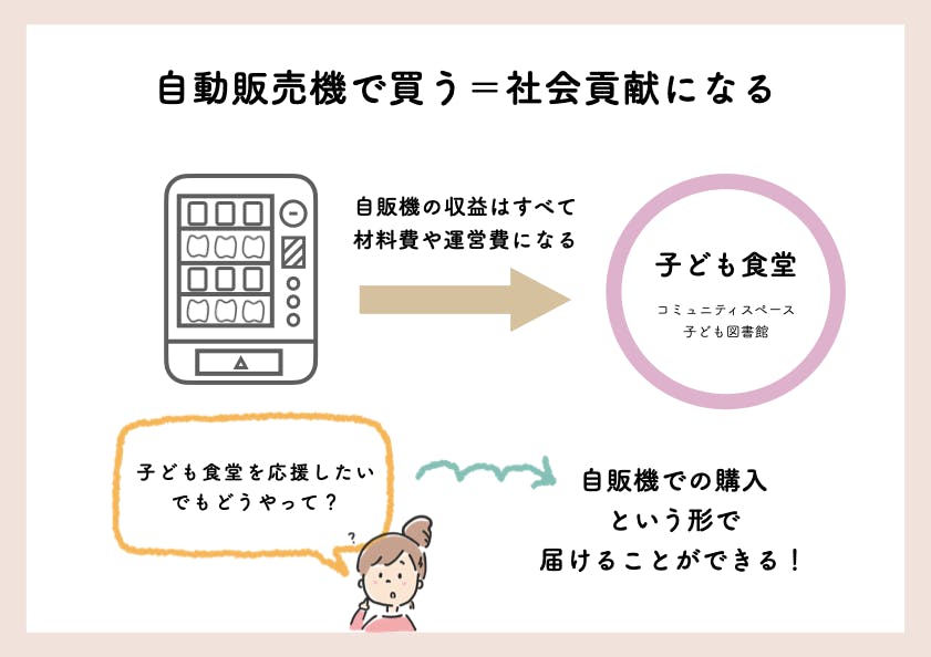 自動販売機の収益は、私的な利益になるのではなく全て子ども食堂や子育て支援事業の運営費となります。