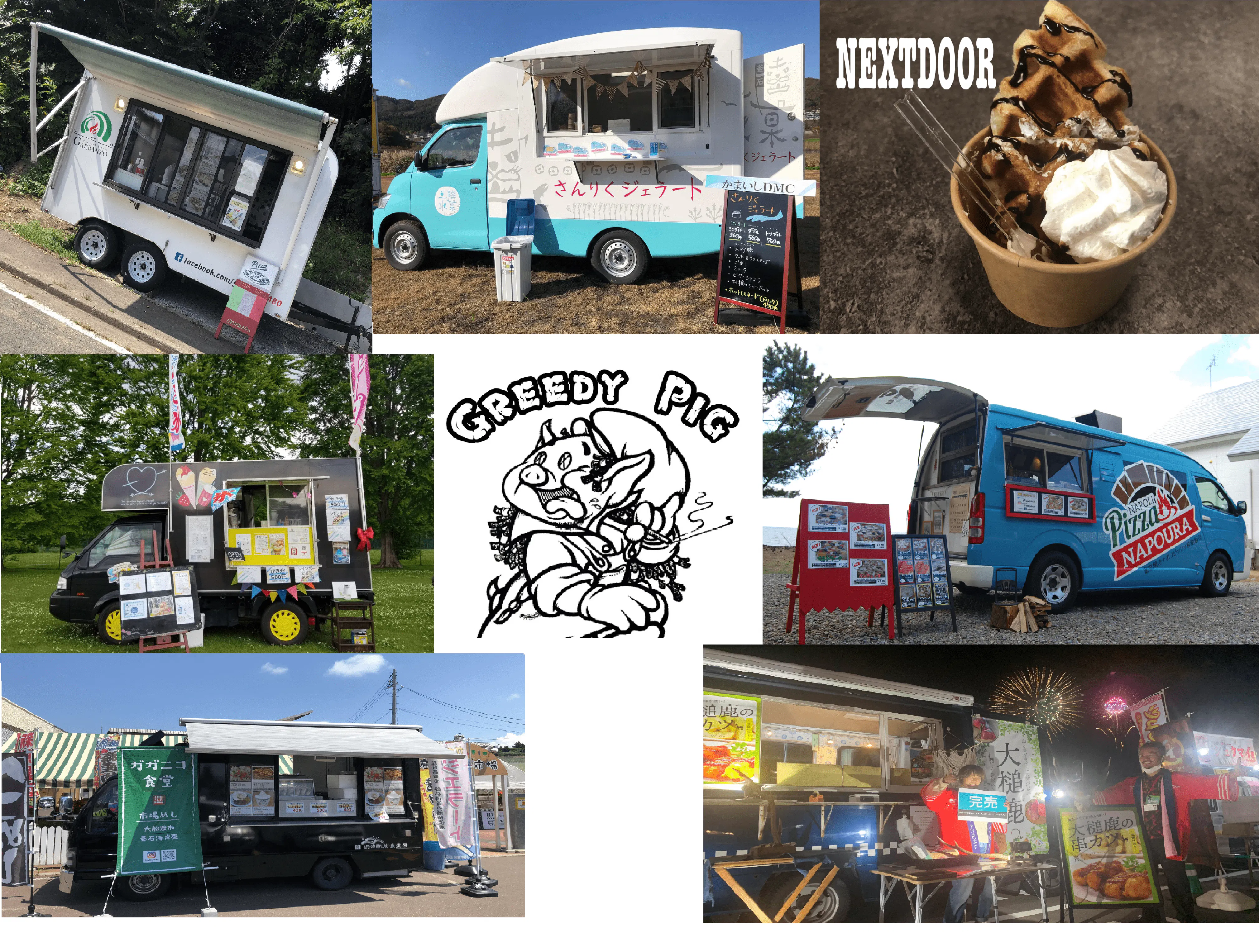フードトラック Greedy pig(食いしん坊)があなたの元へ美味しい物をお届けします!ホットドック、フライドポテト、カラアゲなどをお持ちします。ご賞味ください。