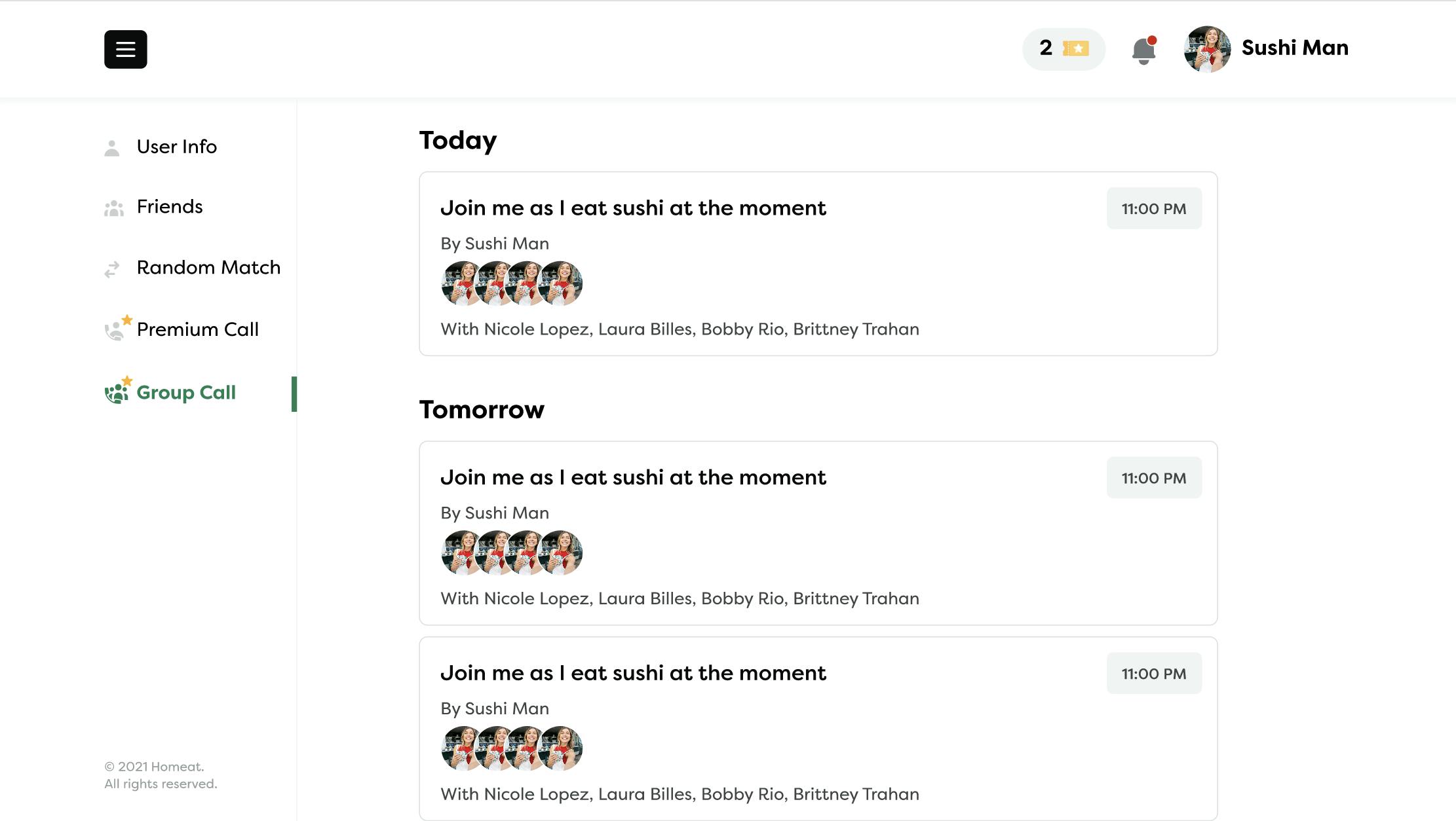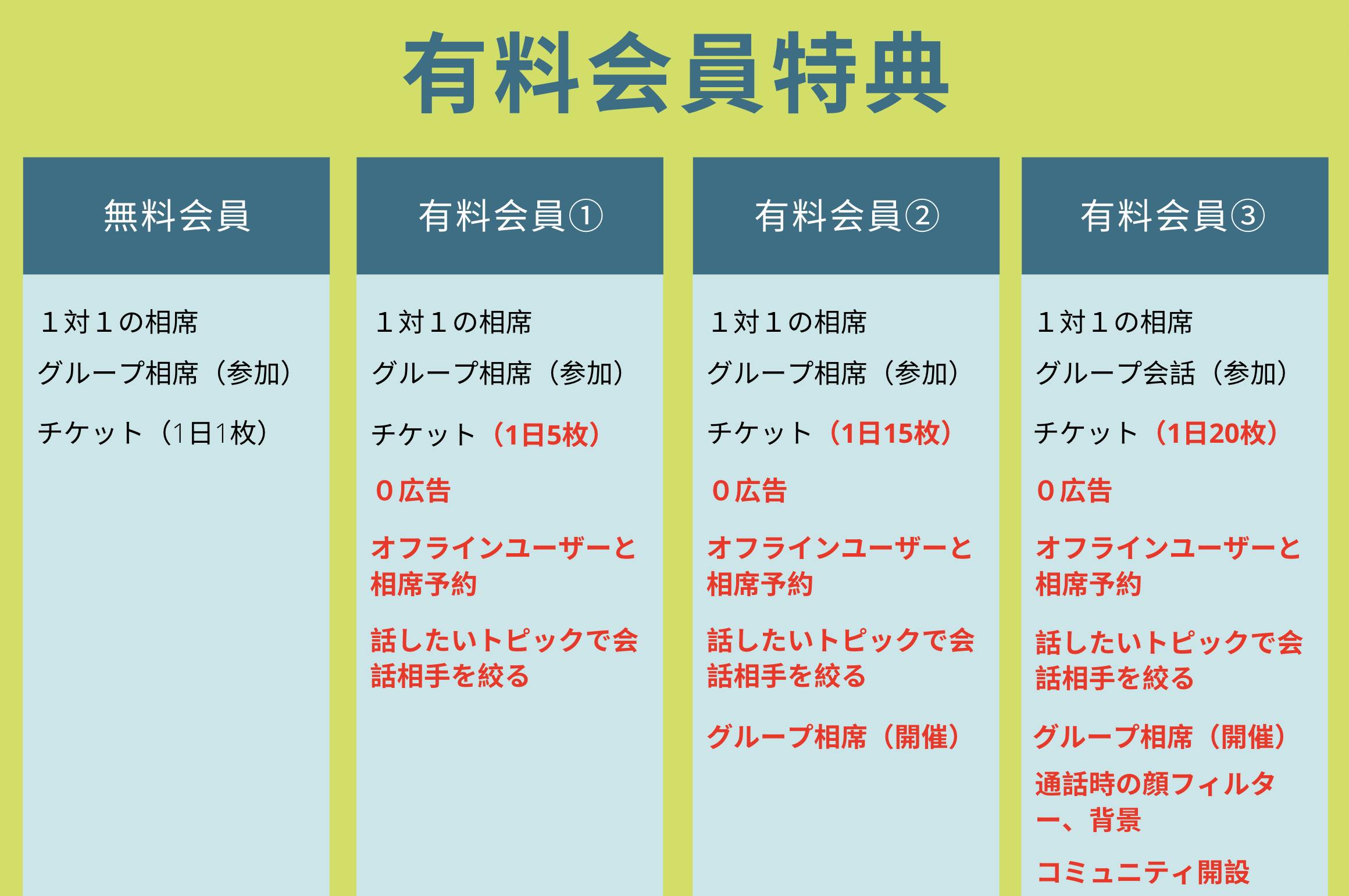 有料会員の特典として、毎日更新されるこのチケットの量、さらにグループ会話、マッチ相手を選べるフィルター、オフラインのユーザーとの電話予約などが出来る様になります。