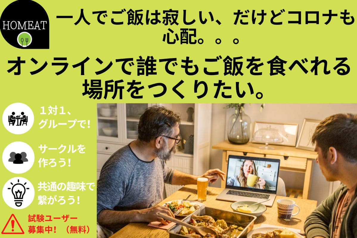 今回のプロジェクトでは、資金集めともう一つ、Homeatを必要としている方や、Homeatで楽しくご飯を食べたい方を募集しています。(無料)