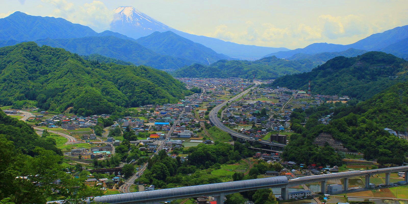 都留市は、新宿から車で1時間、富士山まで30分の位置にある山に囲まれた自然豊かなまちです。