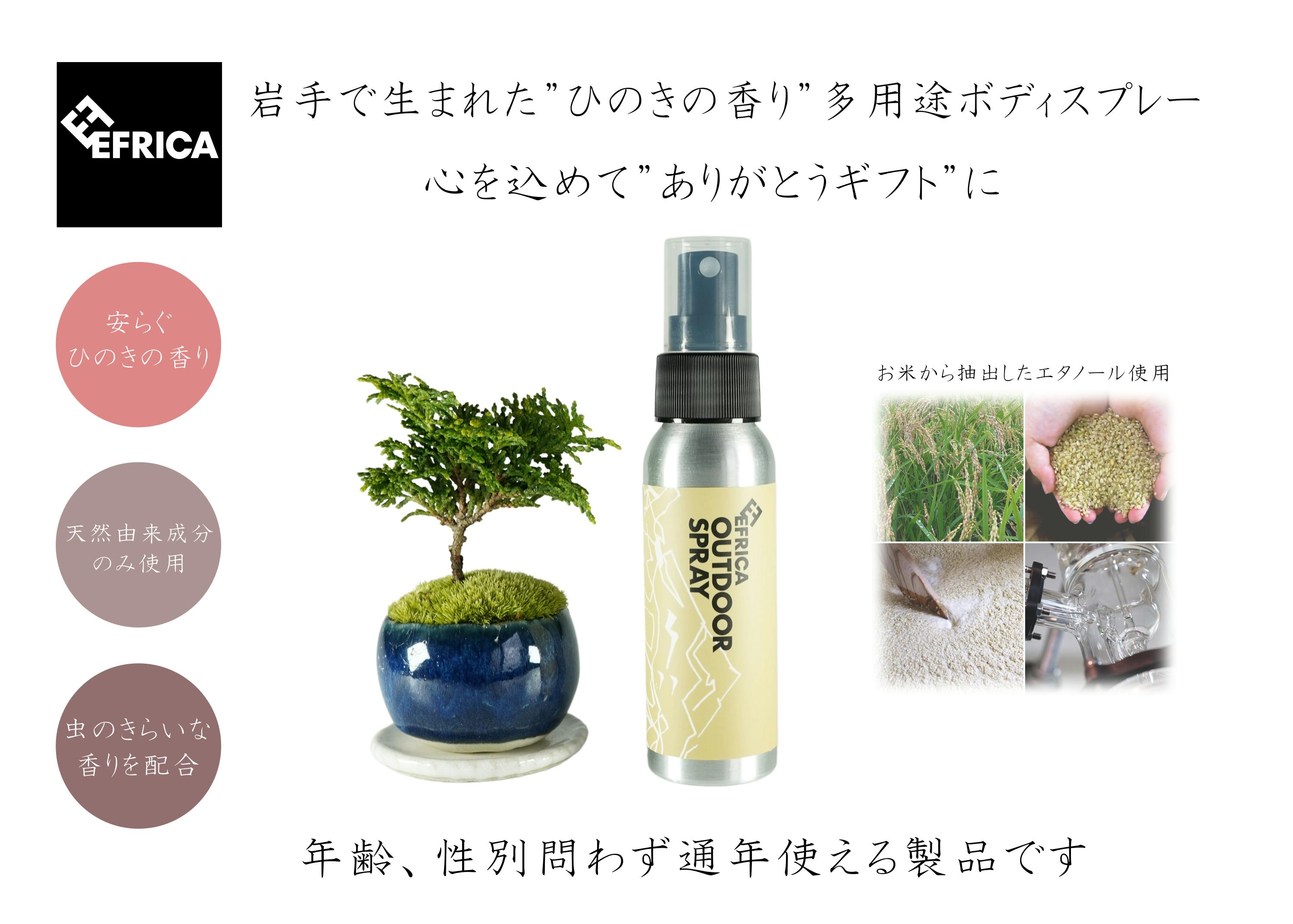 EFRICAアウトドアスプレーはひのきをベースに、清涼感のあるハッカ、ユーカリ、シトロネラを配合しています。原材料には厳選した天然由来成分のみを使用しており、刺激が少なく優しい肌触りで化学由来成分に不安のある方やお子様の肌にもお使いいただけます。アウトドアでのスキンケア、ルームスプレー、ピロースプレー、マスクスプレー、ファブリックスプレーなど多用途に男女、年齢問わず通年使える製品です。持ち運びにちょうど良いボトルサイズですのでバッグに入れておけば日常のあらゆる場面で活躍します。