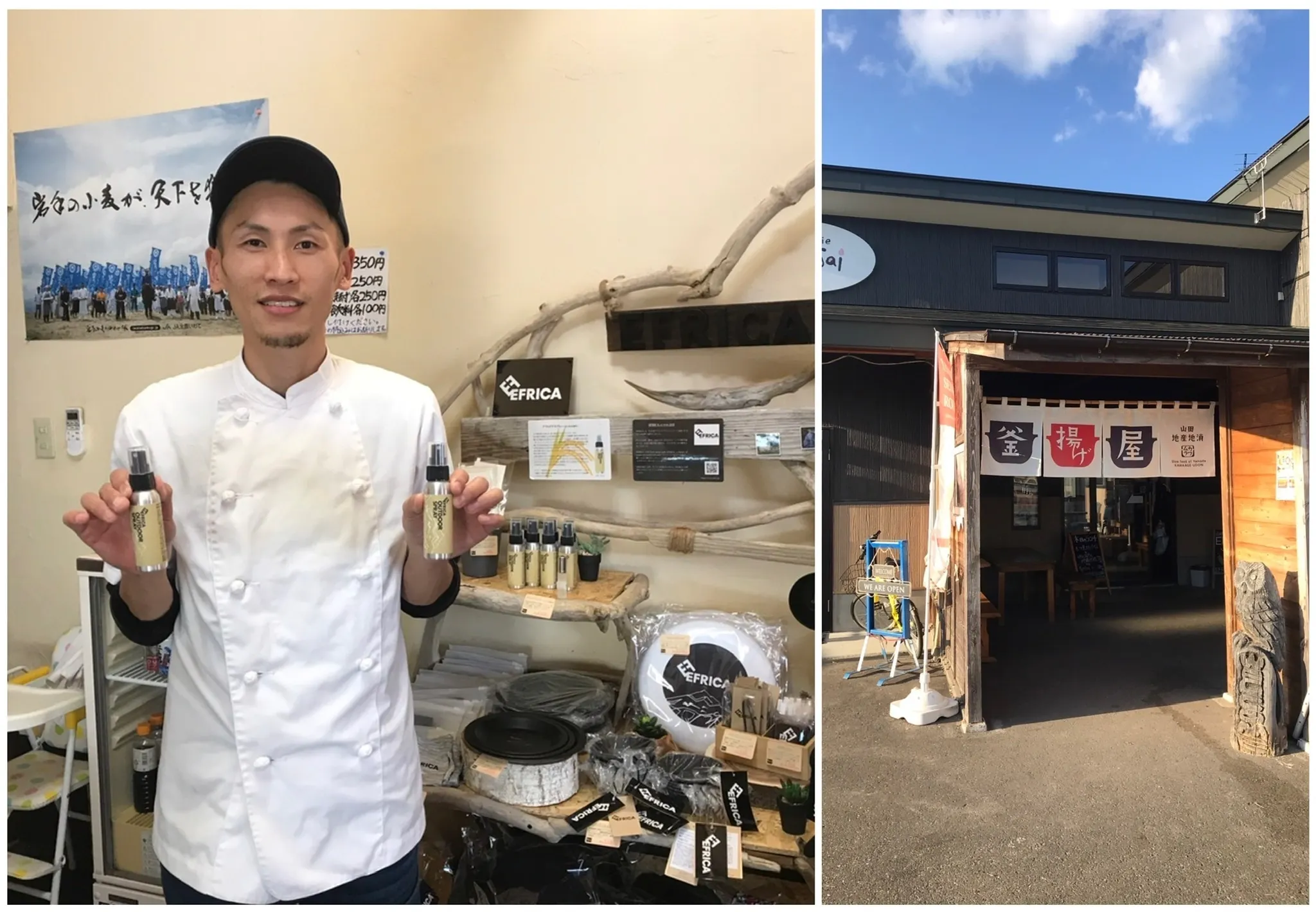 岩手県山田町で地産地消にこだわったうどん店を経営していますが、シーカヤックのインストラクターの他、アウトドアに関連した事業も展開しています。同じ山田町でアウトドアブランドが誕生したということで、店内にEFRICA製品の販売ブースを設けて応援しています。アウトドアスプレーは私も大変気に入っていて、室内、車内、カーテンや枕、布団、マスクなどいろいろなところにシュッと吹きかけ気分転換のアイテムとして使用しています。ひのきの香りがとても良く、手放せないスプレーとなりました。天然由来の成分のみを使用し、化粧品なので肌に直接使えて、環境にやさしくサスティナブルなところも気に入ってます。アウトドアスプレーの豊かなひのきの香りは多くのみなさまの癒しになると思います。釜揚げ屋スタッフ一同、心より応援しています!