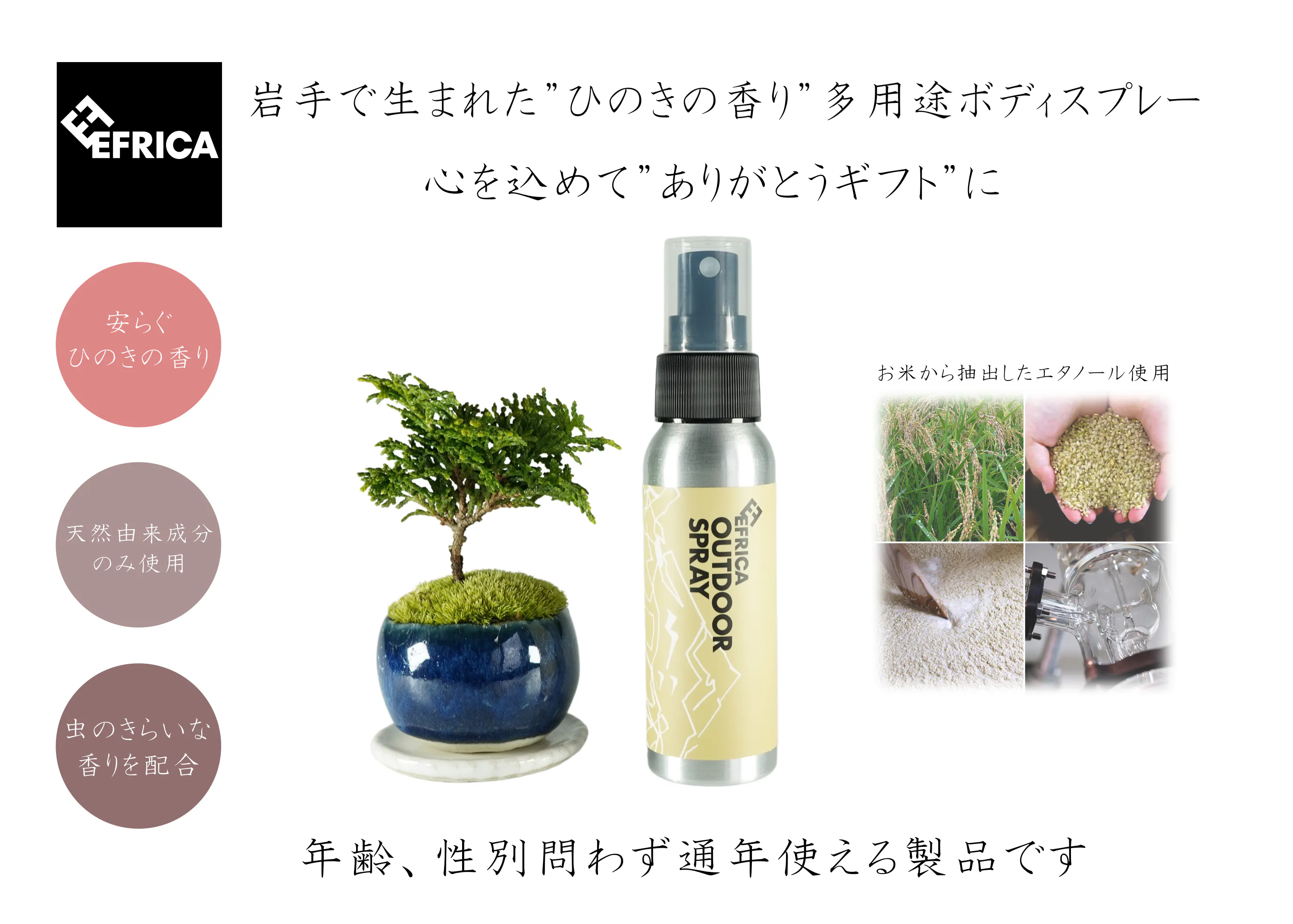 EFRICAアウトドアスプレーは独自の発酵技術を持つ株式会社ファーメンステーションとの共同開発により完成しました。厳選された原料で手間ひまかけてスローに製造しており、さらに未来を見据えたモノ作りのサイクルを実現しています。 岩手県奥州市の米農家さんが休耕田を耕して育てた無農薬・無化学肥料米(有機JAS認証)から抽出したライスエタノールを使用しています。すべて手作業で発酵させたお米の“もろみ”を丁寧に蒸留し時間をかけて抽出されたエタノールはほんのりとお米の香りがします。このライスエタノールに香り高い精油をブレンドし、アロマのように香りが引き立つスプレーに仕上げました。
