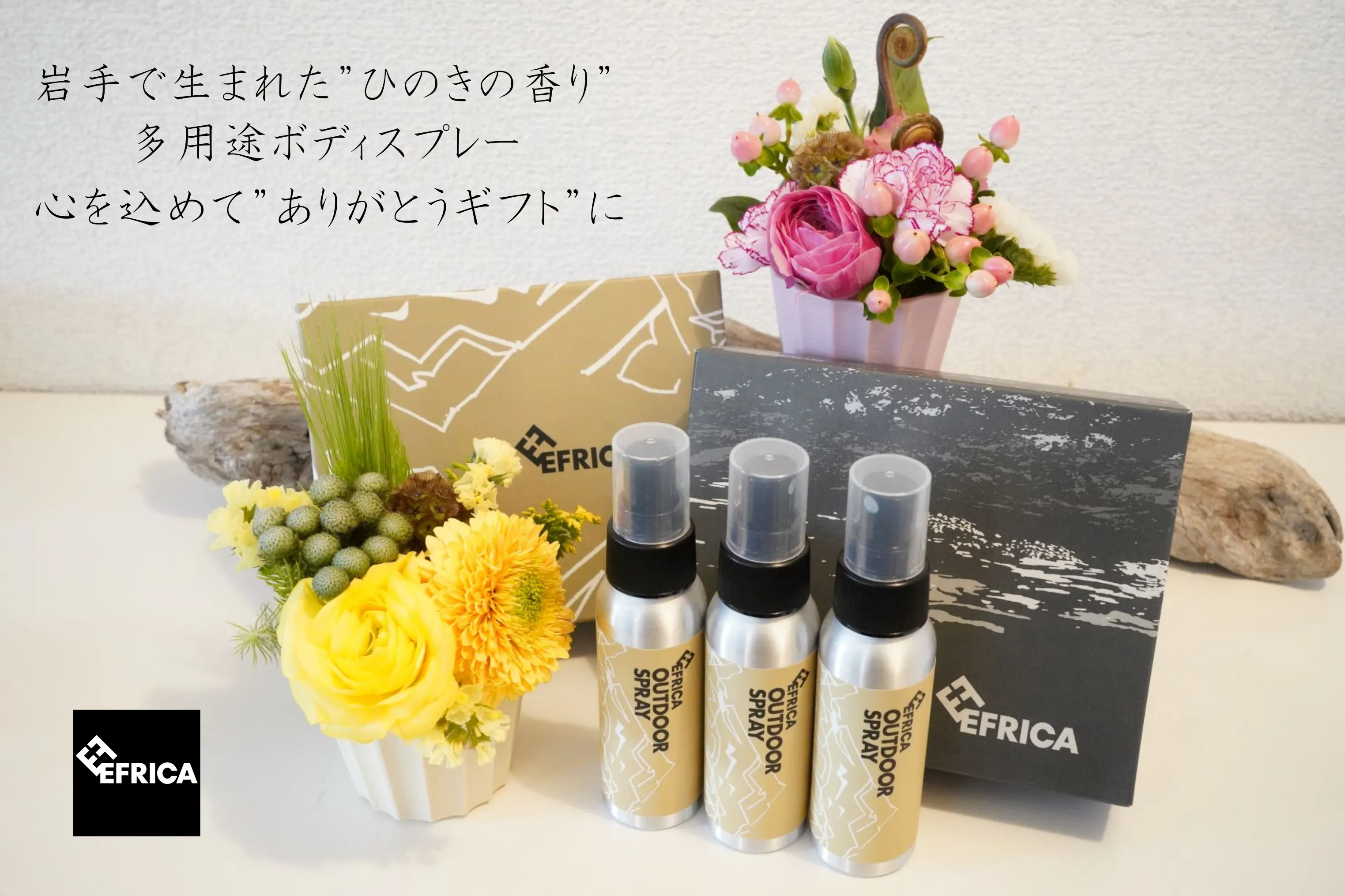 EFRICAでは昨年末にアウトドアスプレーをリリースし、ネットやクラウドファンディングを利用して販売してまいりました。今年1月にCAMPFIREにて実行したチャレンジではお陰様をもちまして目標に対し130%を超える反響をいただきました。各方面からお問合せもいただき、これからの季節のありがとうギフトセットに欲しいとのご要望もありました。