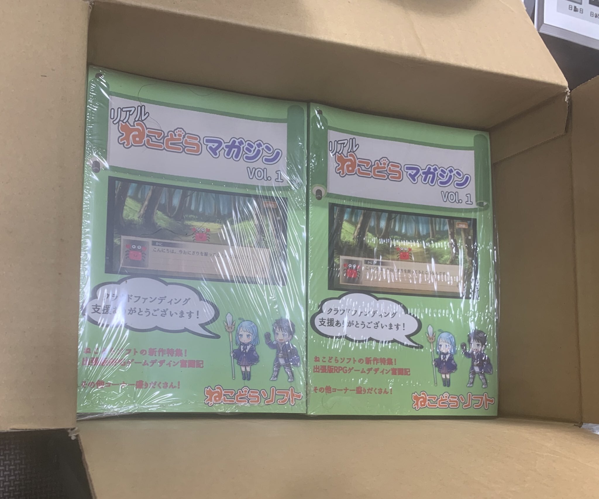 2022/10/03 18:28お世話になっております。「ゲームデザインに特化した電子書籍を作りたい -スマホRPG 5つのネイト制作記-」の活動報告になります。リターン第二弾が、ほぼ完成しました。 (遅くなって申し訳ございません)↑は、テストで実物印刷してみた3000円以上ご支援いただいた方向け「リアルねこどらマガジン」が、大体完成となり 今チェック中です。(現物のリターンを先に終えた方が良いだろう と判断し、こちらを第二弾として制作しました)内容は、・ねこどらソフトの次回作 開発中の紹介・面白かったゲームデザイン紹介 (最近のゲーム編)・面白かったゲームデザイン紹介 (古いゲーム編)・面白かったゲームデザイン紹介 (ボードゲーム編)・5つのネイト 書き下ろし小話・実本だからできる ネタ企画・以前集めたアンケートを使ったゲームネタ などなど、なかなか面白い内容になったのではないかと思います。この後、最終校正のチェックを行い問題がなければ、印刷所に製本順次発送 となる予定です。お時間かかりましたが、今しばらくお待ちください。この次としては、リターン品第三弾として 「5つのネイト+ のゲームデザイン記」の作成を行います。大変お待ちさせてしまい恐縮ですが、良い物を作っていきたいと思っていますので 楽しみにお待ちいただけますと幸いです。----------------------------------------------------------------------------------------------------前回、お伝えしましたとおり 電子書籍の方が無事Kindle にて出版できました。多くの方に読んでいただき、ちょくちょく「面白かった」「参考になった」と感想を貰っています。この電子書籍を書き上げることができたのは、ひとえにクラウドファンディングで応援いただけたお陰に他ありません。改めて、どうもありがとうございました。 もっと見る