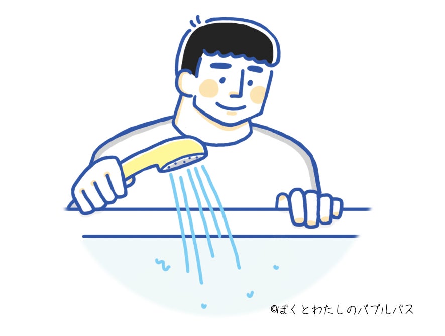蛇口でももちろんOKですが、シャワーの強水流の真下に『ぼくとわたしのバブルバス』を垂らし、お湯を溜めていただくと、より泡立つのでオススメです。