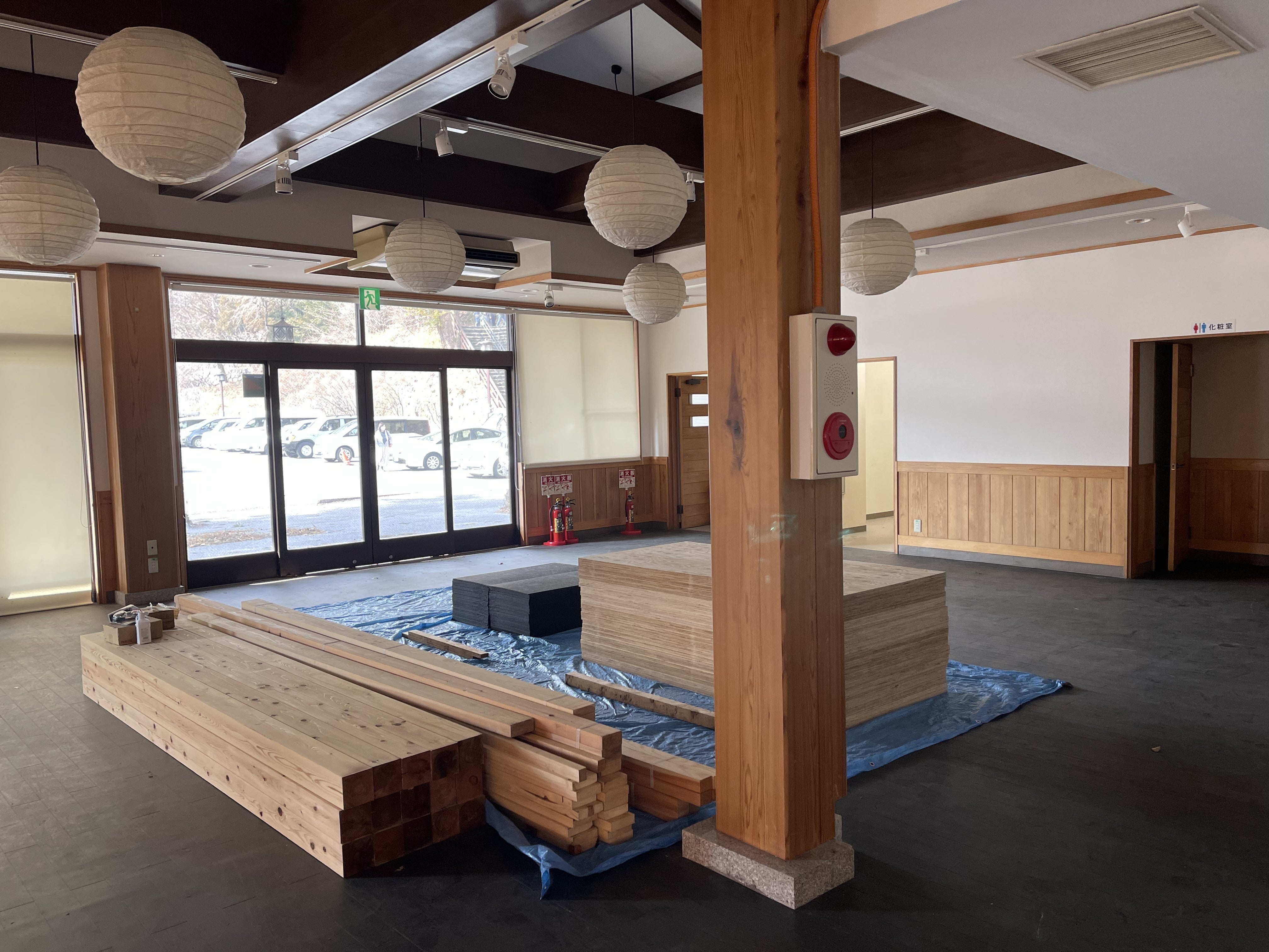 3/20より工事開始。夕方には写真の通り、舞台と花道の土台が完成していました。早い!クッション性&対衝撃性のあるボードを挟んで、飛び跳ねたりしても十分に耐えられるような舞台の構造です。興行場法に適合させるための木戸、換気設備、トイレ周りの設備も今後整えて行くことになります。工事は始まるとあっという間ですね。