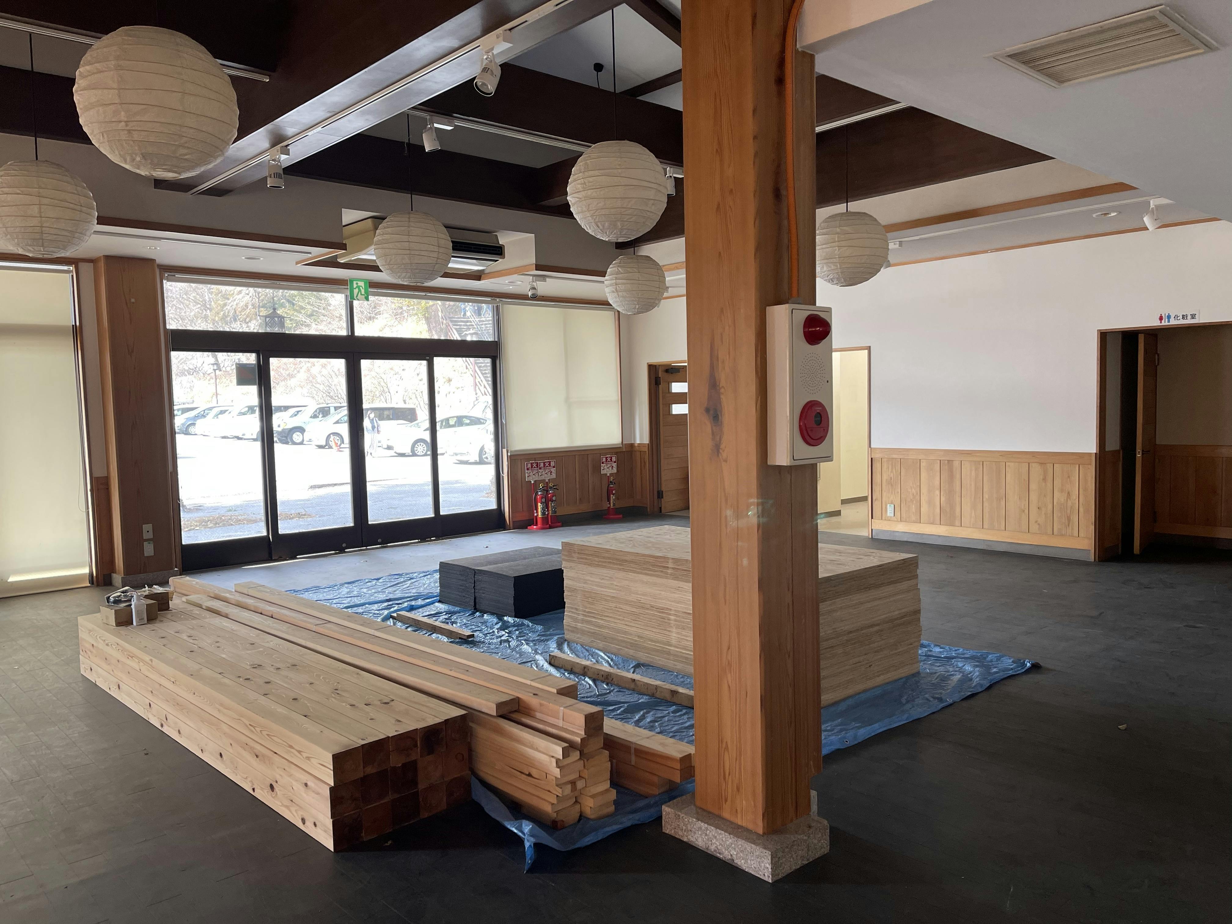 舞台の資材搬入が始まっており、工事は間もなくです。