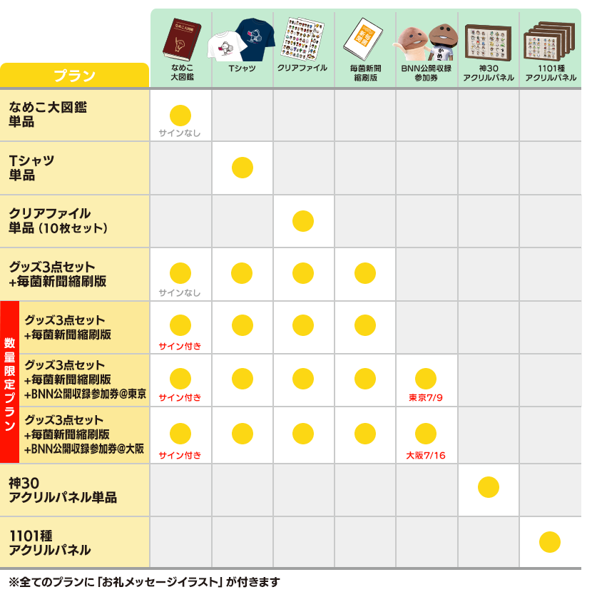 ※数量限定プランのサインは本体表紙裏になめこデザイナー・河合とダンボールなめこの直筆サインが入ります。サインに宛名は入りません。