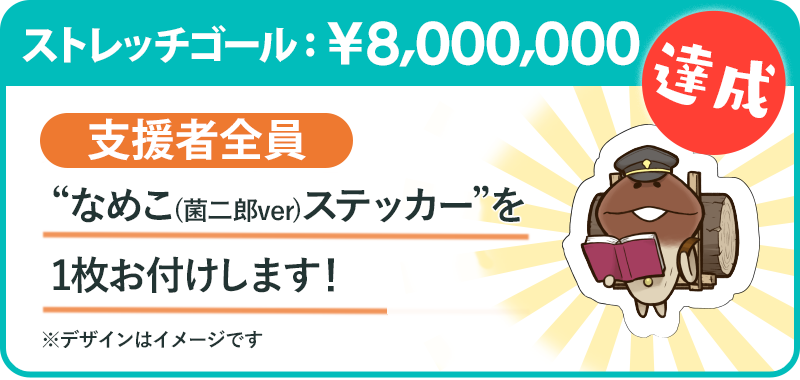 ストレッチゴール[目標800万円]を達成した場合、支援者全員にプラン1口につき1枚「なめこ(菌二郎ver)ダイカットステッカー」をお付けします。