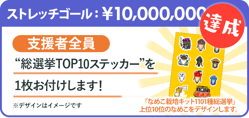 ストレッチゴール[目標1000万円]を達成した場合、支援者全員にプラン1口につき1枚「なめこ総選挙Top10 ステッカー」をお付けします。