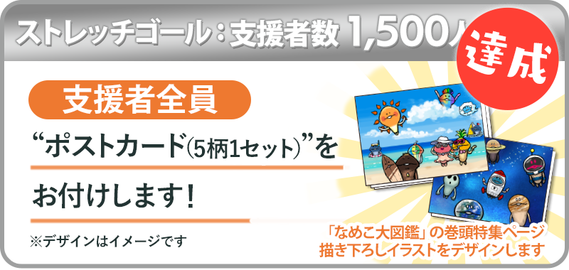 ストレッチゴール[支援者数1500人]を達成した場合、支援者全員にプラン1口につき「『なめこ大図鑑』の巻頭特集ページ 描き下ろしイラストをデザインしたポストカード(5柄1セット)」をお付けします。