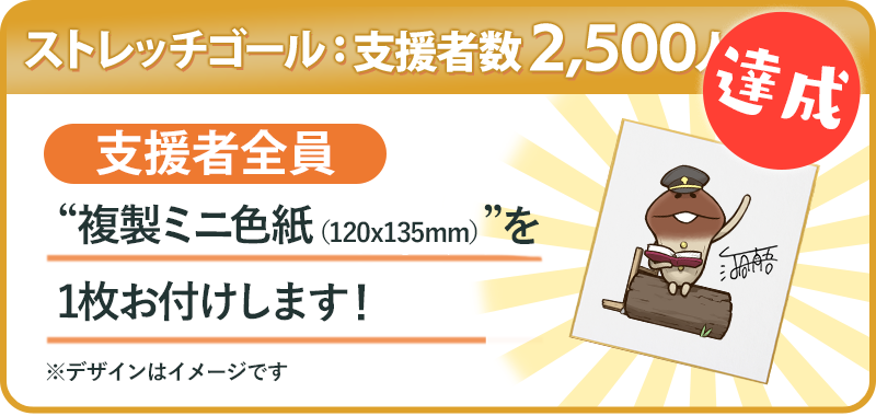 ストレッチゴール[支援者数2500人]を達成した場合、なめこデザイナー河合真吾によるイラストとサインを印刷した「複製ミニ色紙」を支援者全員にプラン1口につき1枚お付けします。