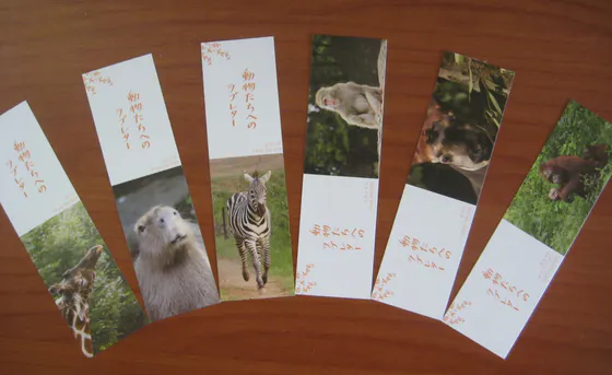 『動物たちへのラブレター』のオリジナルしおりを作りました!本に登場する動物たちとタイトルロゴの入った特製しおりです。全部で6種類作りました。どの動物もみんな表情がすごくいいんです。パトロンの皆さまにはこの6枚をセットにして本と一緒にお届けします。
