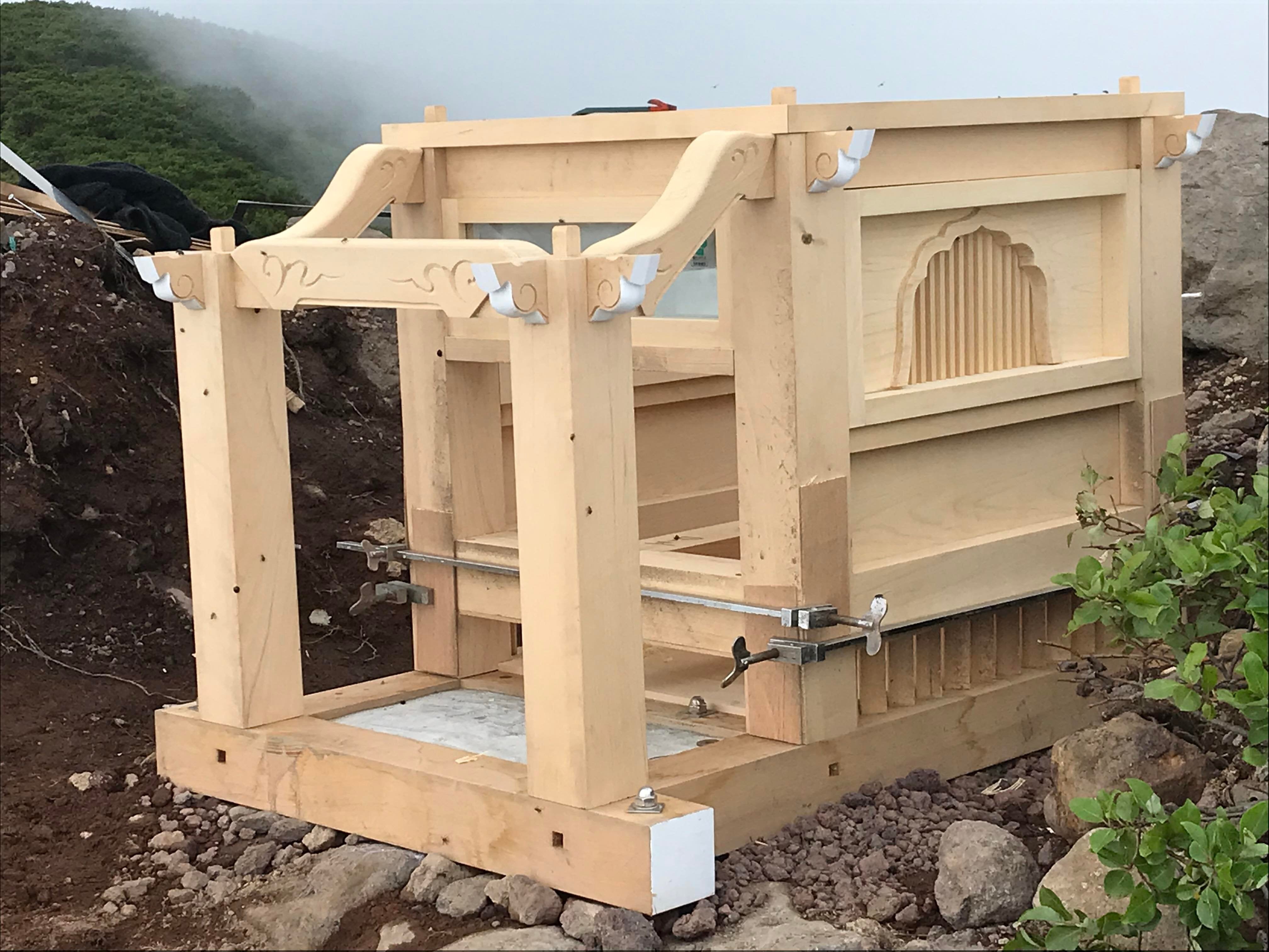 今回この窓の形を採用したのは八甲田山の太陽光をできるだけ多く祠の中に取り入れる為、壊れたり異物が中に侵入しないように強化ガラスでしっかりと内部を守ります。